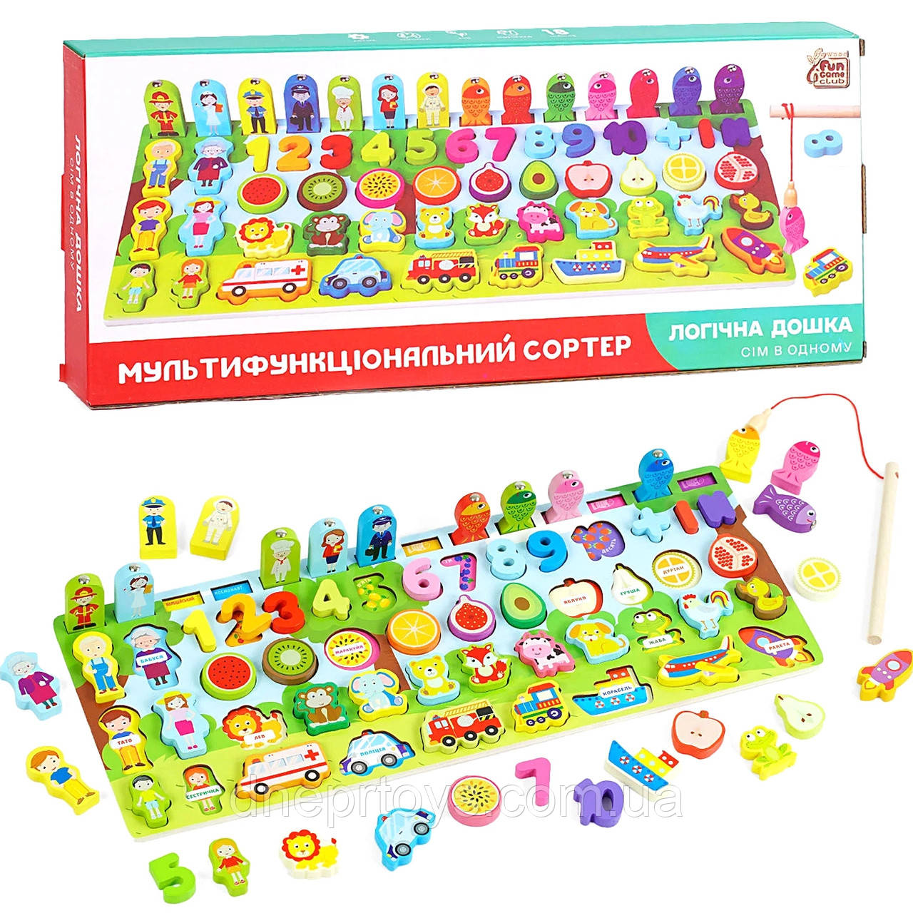 Дерев`яна логічна дошка 7в1 4FUN Game Club Wood магнітна риболовля сортери цифри кольори фрукти професії транспорт професії